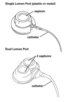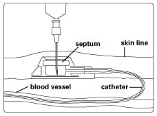 The catheter connects to the septum. The catheter takes the medicine or fluids right into the blood. Blood for lab tests can also be taken out through the catheter. When the needle is removed from the septum, no fluids or blood can leak out. The port can be used on the same day it is put in.